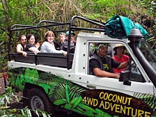 4WDの荷台席に乗車し、ガイドの案内で島の見所を巡ります。ローカルフルーツ畑見学や、時には小川を渡ったり、アドベンチャーも楽しめます。 山の山頂付近からの景色は一見の価値あり!