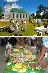 教会に来る女性は色鮮やかなアイランドドレスをまとい、手編みの帽子(Rito Hut)をかぶって正装します。